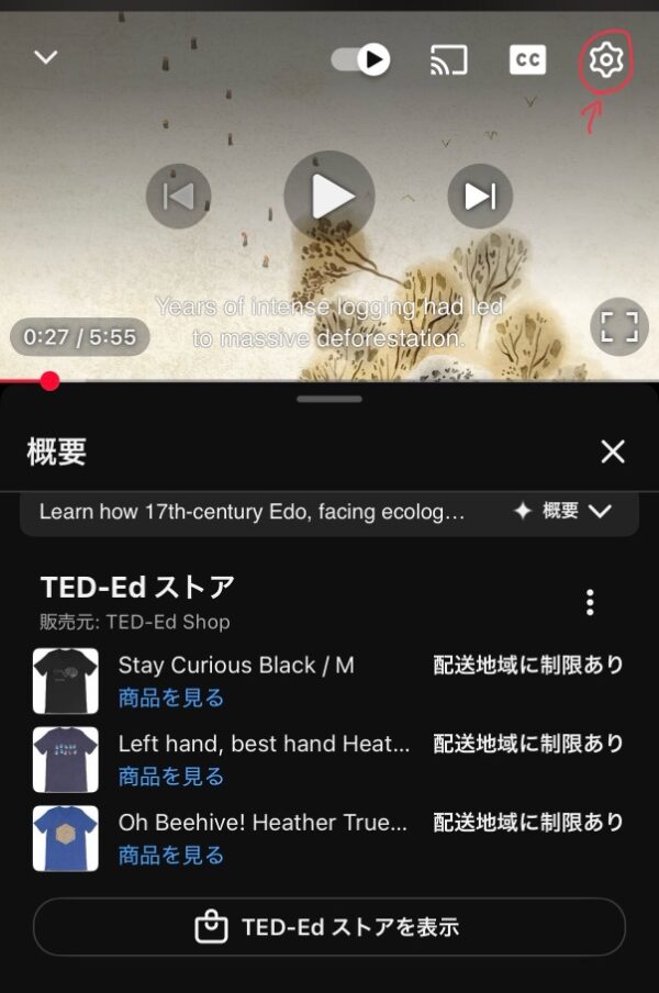 画面をタップすると、右上に設定のアイコン(赤丸)が表示されます。